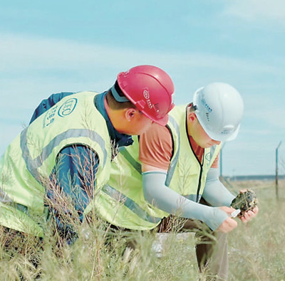在東方電氣中亞陸龜苗圃中,工作人員協(xié)同當?shù)厣鷳B(tài)專家檢查中亞陸龜健康狀況。東方電氣集團供圖