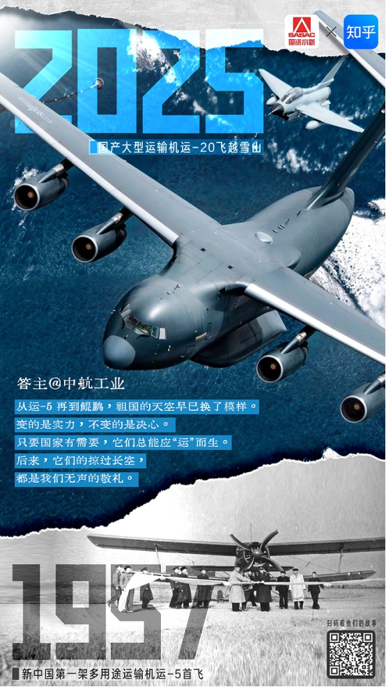 運-20“鯤鵬”穿越云層呼嘯而過,47米的機身已能馱載66噸跨越洲際。運-5是起點,運-20卻不是終點,無論何時何地,只要國家需要,它們總能應“運”而生。每一次掠過長空,都是我們對您無聲的致敬。
