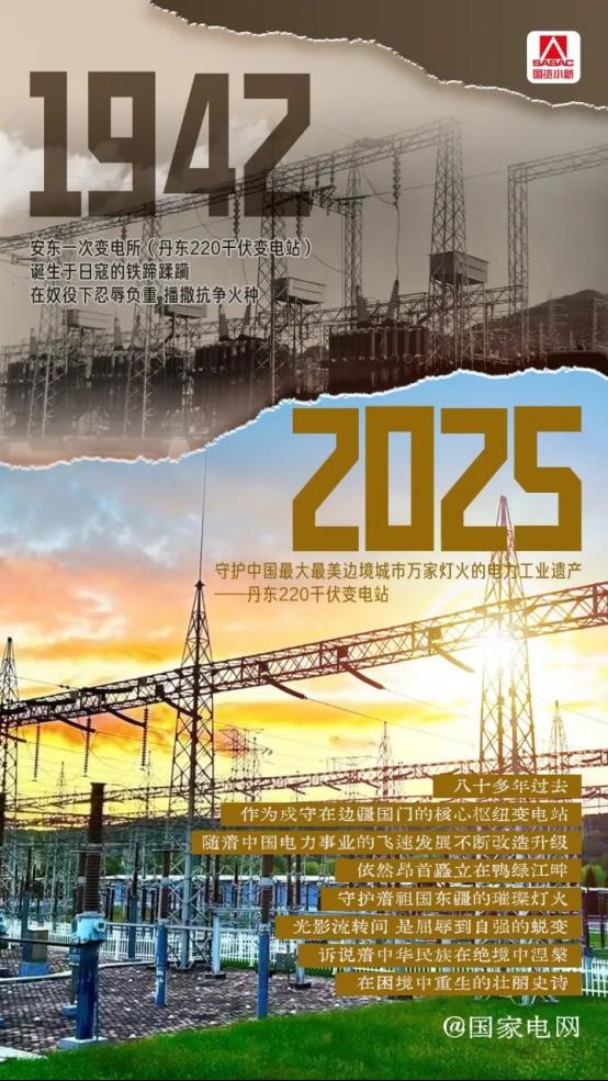 如今,這座變電站與世界領先的智能電網設備并肩而立,守護著英雄之城的璀璨燈火。它昂首矗立在鴨綠江畔,多么像您和無數英雄前輩曾經戰斗時的英姿。