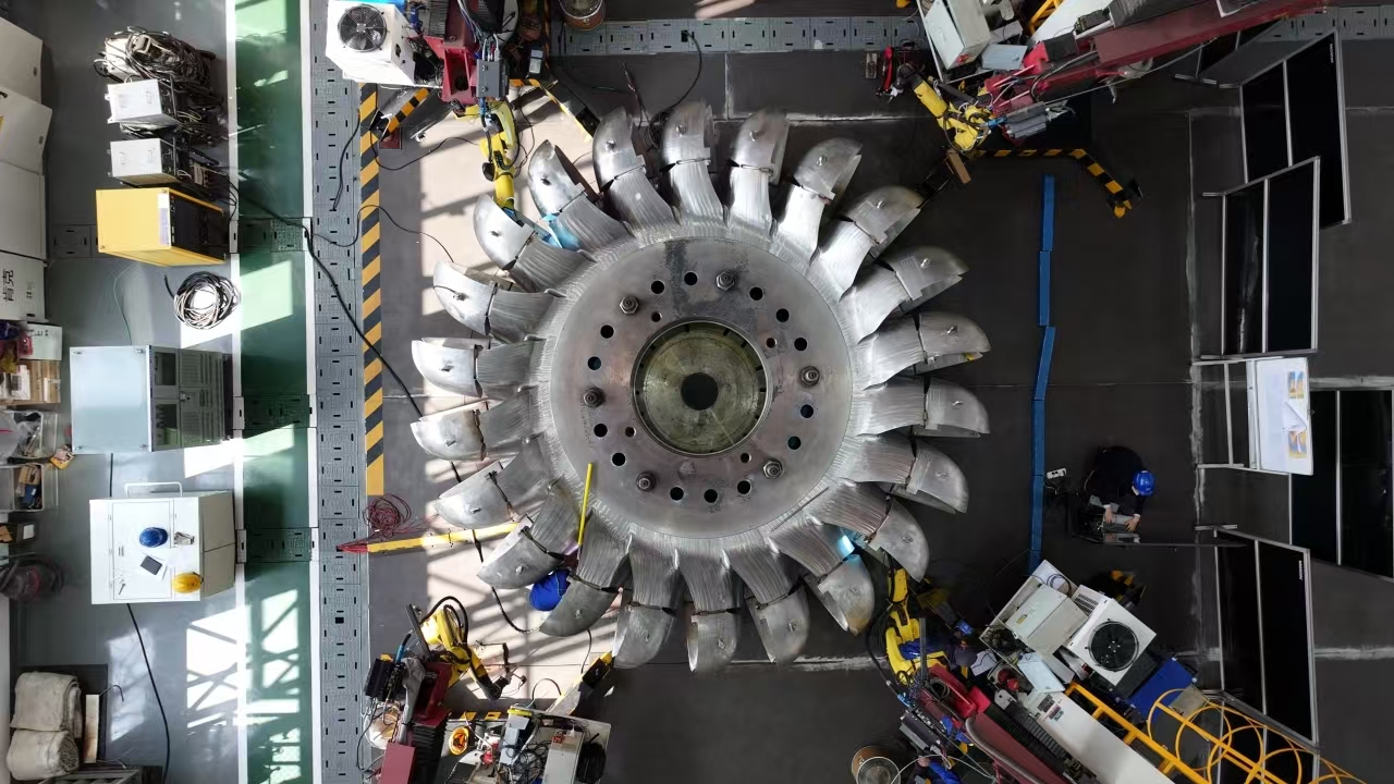 近年來(lái),針對(duì)大型沖擊式轉(zhuǎn)輪研制,東方電氣集團(tuán)開(kāi)發(fā)了智能化增材制造(3D打印)、自動(dòng)化數(shù)控加工、機(jī)器人焊接、機(jī)器人打磨等技術(shù)。本次通過(guò)驗(yàn)證的轉(zhuǎn)輪直徑6.2米,整體重量達(dá)到90噸,95%以上制造過(guò)程實(shí)現(xiàn)了數(shù)字化、智能化。