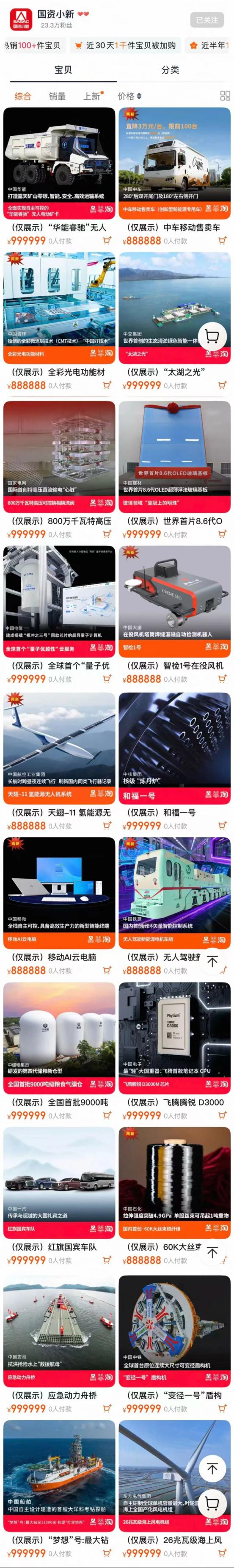 可以看到,今年“國(guó)資小新”在淘寶共上架20件大國(guó)重器,涉及信息技術(shù)、人工智能、航空航天、新能源、新材料、高端裝備、量子科技等多個(gè)領(lǐng)域。其中8件帶有“全球首個(gè)”或“全球之最”標(biāo)簽、7件擁有“國(guó)內(nèi)首個(gè)”或“國(guó)內(nèi)之最”稱號(hào)。