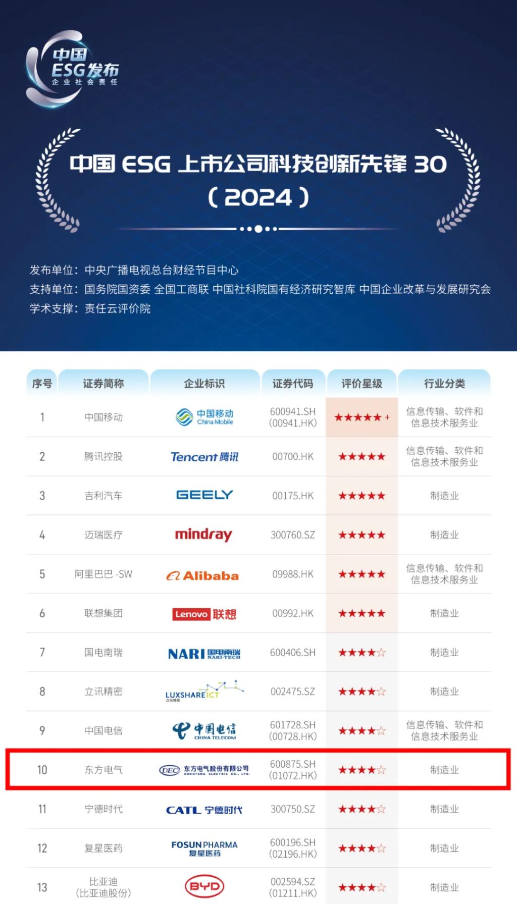 東方電氣成功入選“中國ESG上市公司科技創(chuàng)新先鋒30(2024)”榜單