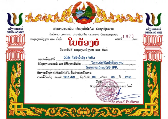 老撾能源礦產部授予的部級榮譽證書