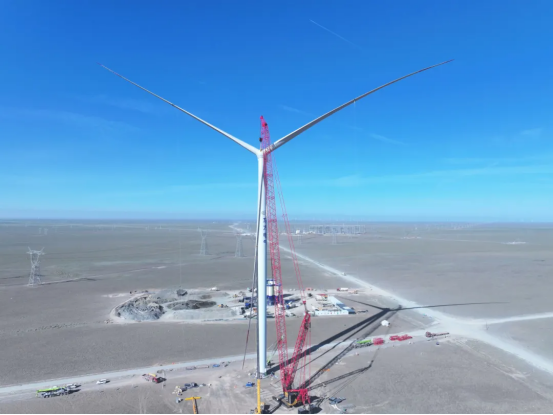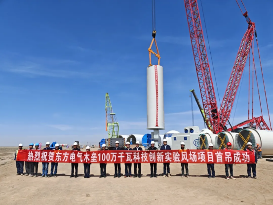 近日,在新疆木壘廣袤的戈壁灘上,由東方電氣集團所屬東方風電承建的東方電氣木壘100萬千瓦科技創新實驗風場順利完成首臺風機吊裝,以“硬核速度”交出又一答卷。