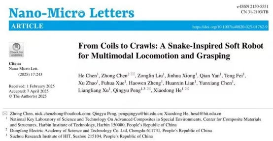 相關成果以《From Coils to Crawls: A Snake-Inspired Soft Robot for Multimodal Locomotion and Grasping》為題,東方研究院陳仲博士與哈爾濱工業大學赫曉東院士、彭慶宇教授為共同通訊作者。