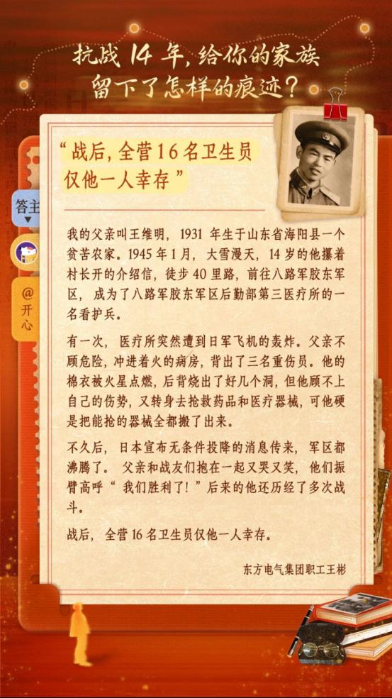 不久后,日本宣布無條件投降的消息傳來,軍區都沸騰了。父親和戰友們抱在一起又哭又笑,他們用振臂高呼“我們勝利了!”后來的他還歷經了多次戰斗。戰后,全營16名衛生員僅他一人幸存。