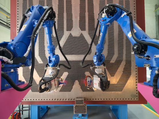 ▲東方汽輪機綠色高效焊接數(shù)字化車間-凝汽器管孔自動焊設備