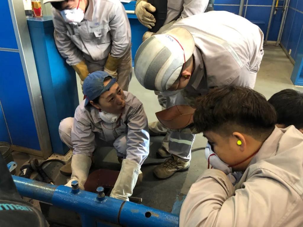 “火星飛濺到鞋子里時(shí)最難受,也不能挪動(dòng),鞋子勒得緊,只能等它自己降溫?!?即便穿著防護(hù)服、耐高溫鞋,焊工體感溫度依然達(dá)到45℃?!拔矣脧U舊木架做了隔熱工裝,腳底就沒(méi)這么燙了,木架陪著我們焊了一臺(tái)又一臺(tái),用到快散架了,大家還舍不得扔掉。”沒(méi)有先進(jìn)經(jīng)驗(yàn)可以借鑒,白映玉只能靠自己不斷摸索、不斷總結(jié)。“這條焊縫一次性焊接成功率低,主要原因是在高溫、狹小空間內(nèi)作業(yè),每一班要2個(gè)焊工輪著進(jìn)去,每一次只能在筒內(nèi)待15到20分鐘,而每個(gè)人操作手法又不一樣?!闭业搅穗y點(diǎn)突破口,白映玉帶領(lǐng)團(tuán)隊(duì)成員進(jìn)行焊接前的風(fēng)險(xiǎn)防范,對(duì)工位、焊機(jī)、焊接參數(shù)和作業(yè)流程都制定了明確詳細(xì)的操作標(biāo)準(zhǔn)。