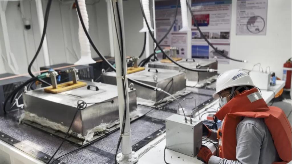 在緊張的試驗進程中,“東福一號”屹立于海天之間,持續保持運行開展海上無淡化制氫。剛開始幾天試驗很順利,海面風平浪靜。第5天開始,海浪翻滾,狂風將“東福一號”顛得左搖右擺,仿佛隨時都有可能被吞噬。艙內,悶熱缺氧的環境中,團隊成員依然緊盯著制氫設備,海浪的撞擊讓他們的胃里翻涌不止。陳屹是其中一員,他跪趴在欄桿邊,扶著欄桿便吐了起來,海風帶來的咸腥濕氣讓他的不適更加劇烈,但他眼神中依然透露出堅定與執著。