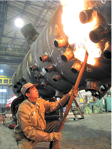 2005年,鐘家權光榮退休了,但是,摯愛東鍋的鐘家權,在公司、車間領導和職工的關心支持下,又拿起了焊槍,與昔日的伙伴們一起奮戰在核電工段,參與了廣東嶺澳核電站二期1000MW核島主設備制造。經過1年時間的艱苦奮斗,2006年8月份,順利完成3臺安注箱的焊接任務;2006年10月初,要求高、工作條件最為艱苦的1臺硼注射器焊接難關又被攻克了,為東方鍋爐按期履行合同做出了新的貢獻。在安注箱啟運前的那一刻,鐘家權讓記者拍照留下了這一令他一輩子自豪而又難忘的瞬間……