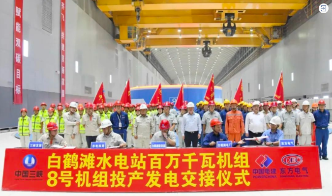 2022年9月22日,隨著8號機組完成72小時試運行,金沙江白鶴灘水電站左岸全部8臺機組投產。至此,東方電氣白鶴灘項目研發制造、安裝服務任務圓滿收官。