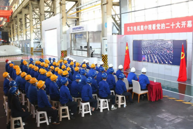 上午10時,東方電氣集團2萬多名黨員干部職工懷著激動和喜悅的心情,在全國31個省市自治區及境外工程項目現場的248個會場,通過電視和互聯網等方式,同步收聽收看黨的二十大開幕會,認真聆聽習近平總書記的工作報告。