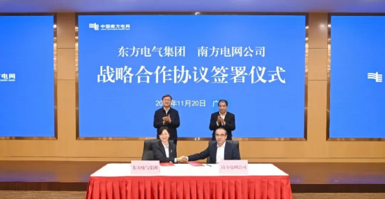11月20日,中國(guó)東方電氣集團(tuán)有限公司與中國(guó)南方電網(wǎng)有限責(zé)任公司在廣州簽署戰(zhàn)略合作協(xié)議。東方電氣集團(tuán)黨組書記、董事長(zhǎng)羅乾宜,南方電網(wǎng)公司黨組書記、董事長(zhǎng)孟振平,共同見證協(xié)議簽署。集團(tuán)公司黨組成員、總會(huì)計(jì)師呂雙與南方電網(wǎng)公司黨組成員、副總經(jīng)理吳小辰代表雙方簽訂協(xié)議。